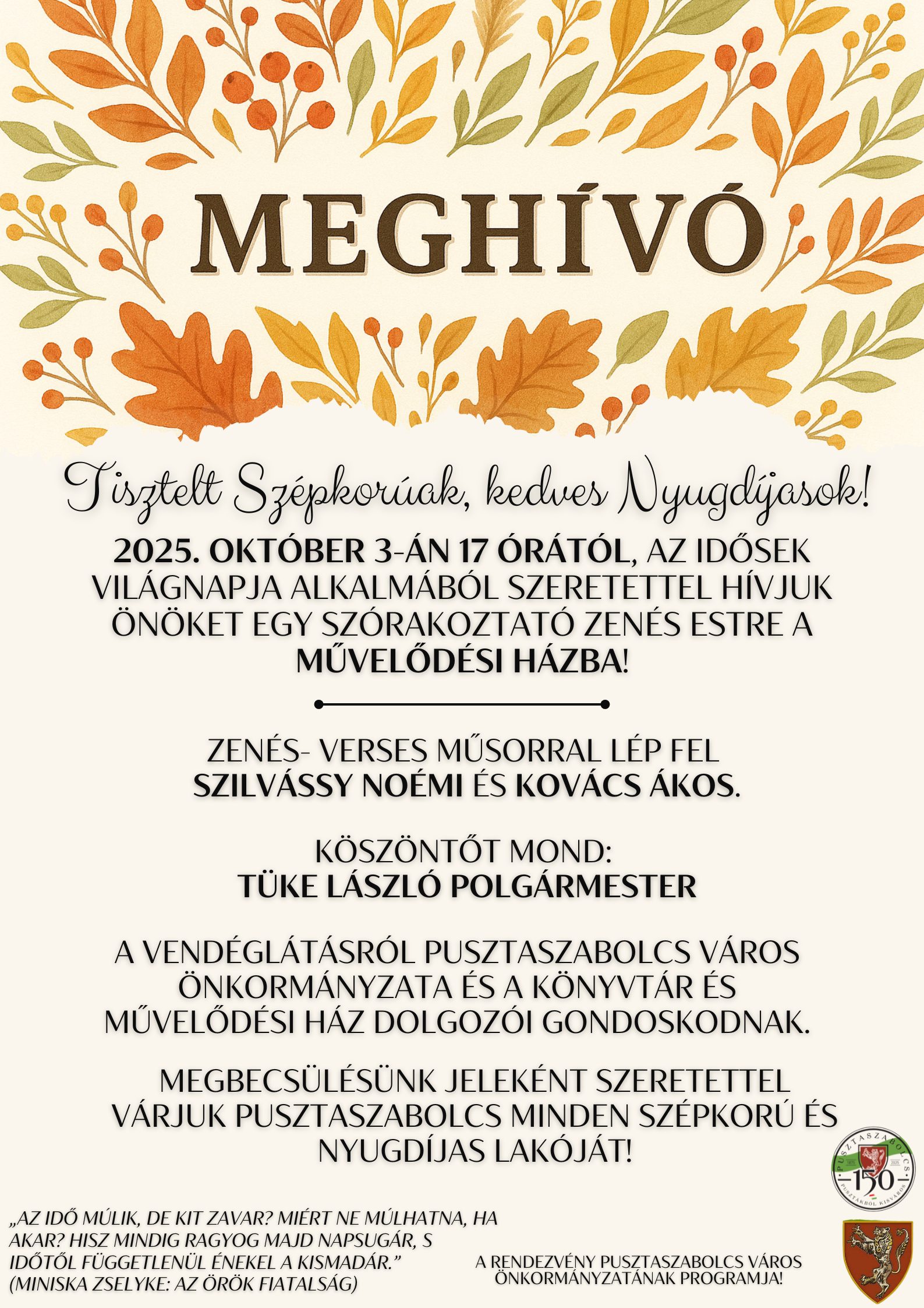 Idősek VilágnapjaSzeretettel várjuk a szépkorúakat október 3-án, 17:00-tól! Bartók András2025-09-26T14:29:49+00:00 Ajánlott bejegyzések Meseterápia szeptember 26th, 2025 | 0 hozzászólás Mesekocsma szeptember 26th, 2025 | 0 hozzászólás Új csoport indul! szeptember 8th, 2025 | 0 hozzászólás PetraFit szeptember 8th, 2025 | 0 hozzászólás Latin Ritmus szeptember 8th, 2025 | 0 hozzászólás