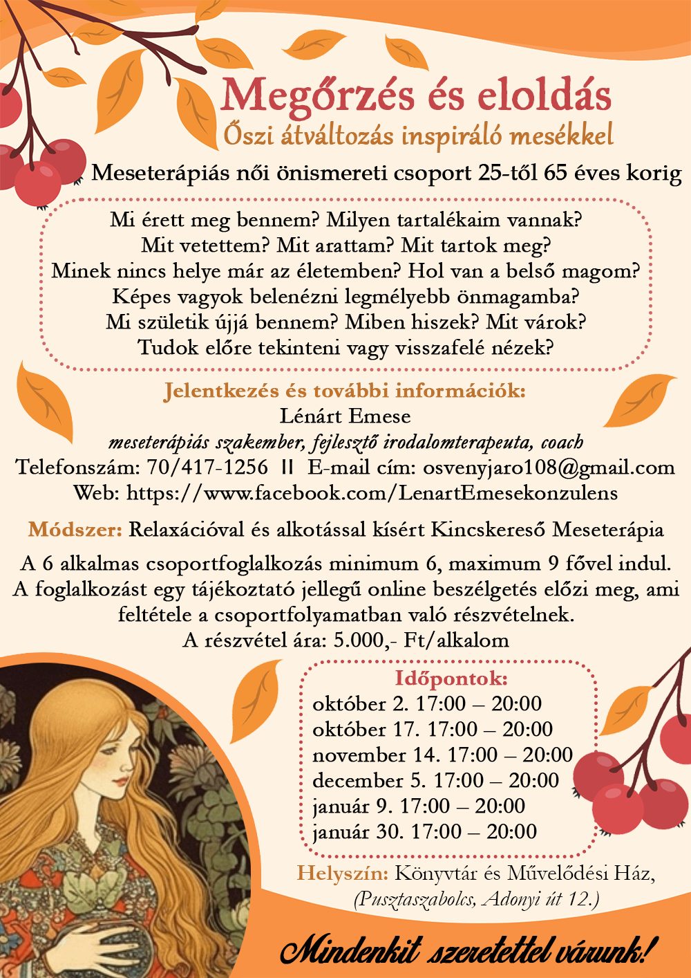 Októberi indulással ismét meseterápiás foglalkozás lesz a könyvtárban, amire 25 és 65 év közötti hölgyeket várunk. Jelentkezni a plakáton megadott elérhetőségek egyikén lehet. Várjuk azokat, akik az őszi és a téli hónapok folyamán, meséken és kreatív feladatokon keresztül szeretnék saját magukat jobban megismerni.